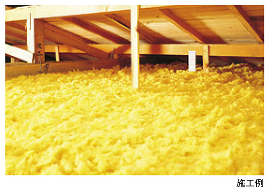ガラス繊維を隙間なく施工できるブローイング工法で屋根裏の断熱を行います。